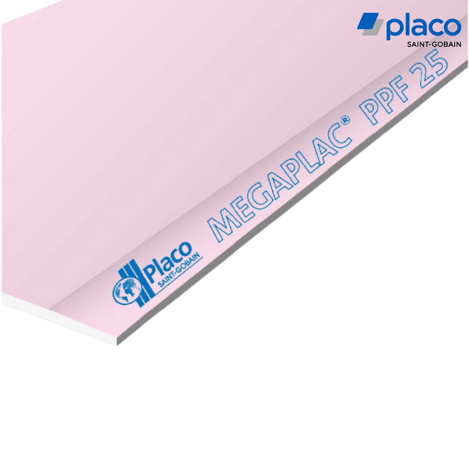 Placa de yeso Megaplac PPF de espesor 25 con ancho 900 y largo 2,50 metros. Además de sus características de alta durabilidad por ser Megaplac, tiene propiedas de resistencia contra incendios (PPF), pudiendo llegar a una resistencia al fuego (EI) de 120 minutos si se instalan dos placas.